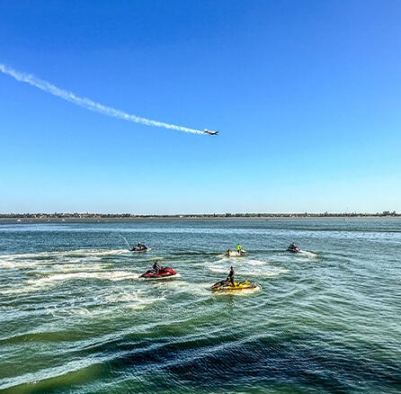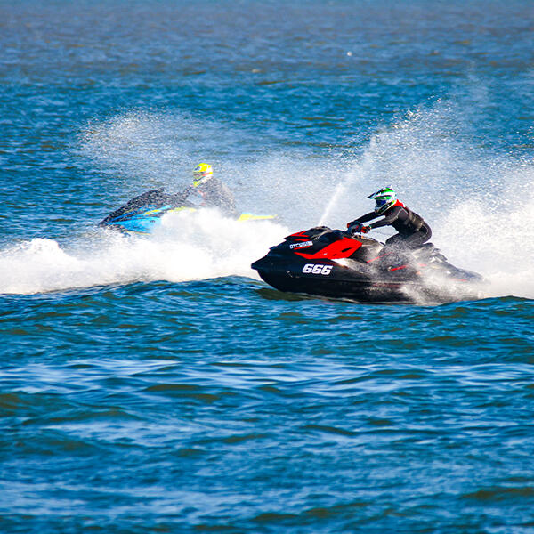 Atividades aquáticas e demonstrações de jet ski na Baía de Maputo, com velocidade e precisão.